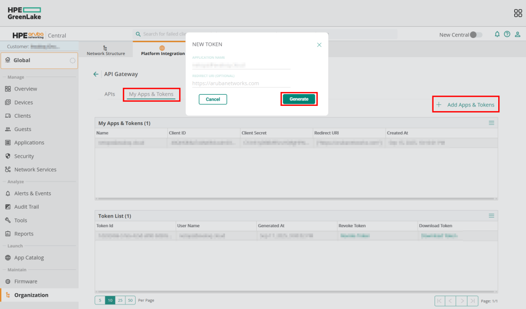 The first time you get there, you will not see any items, but under the “My Apps & Tokens” tab you can click the “Add Apps & Tokens” button and generate it. Technically, this is already enough to start to monitoring your network infrastructure, but within two hours it would stop. So the relevant data for us are the “Client ID” and “Client Secret.” Feel free to revoke the recently created token at the bottom area as we do not need it.