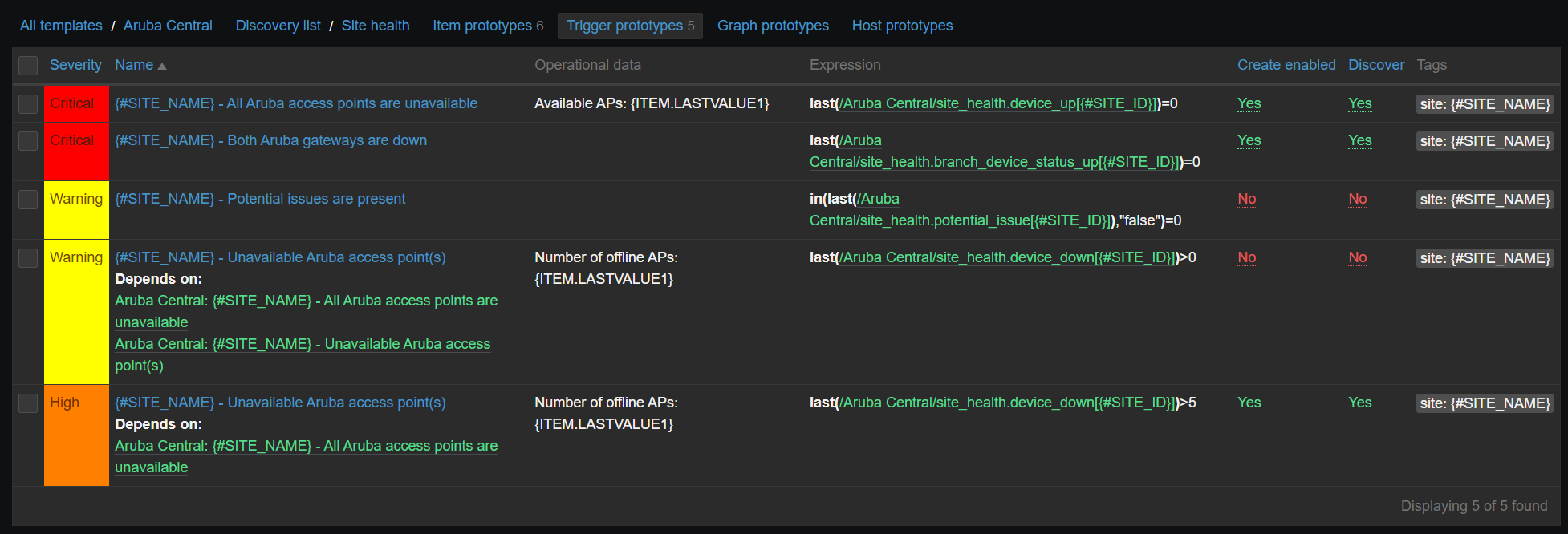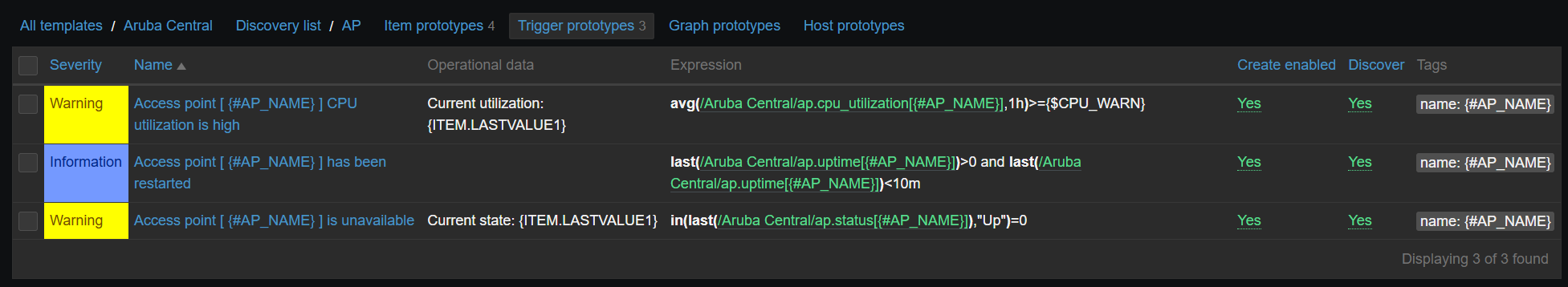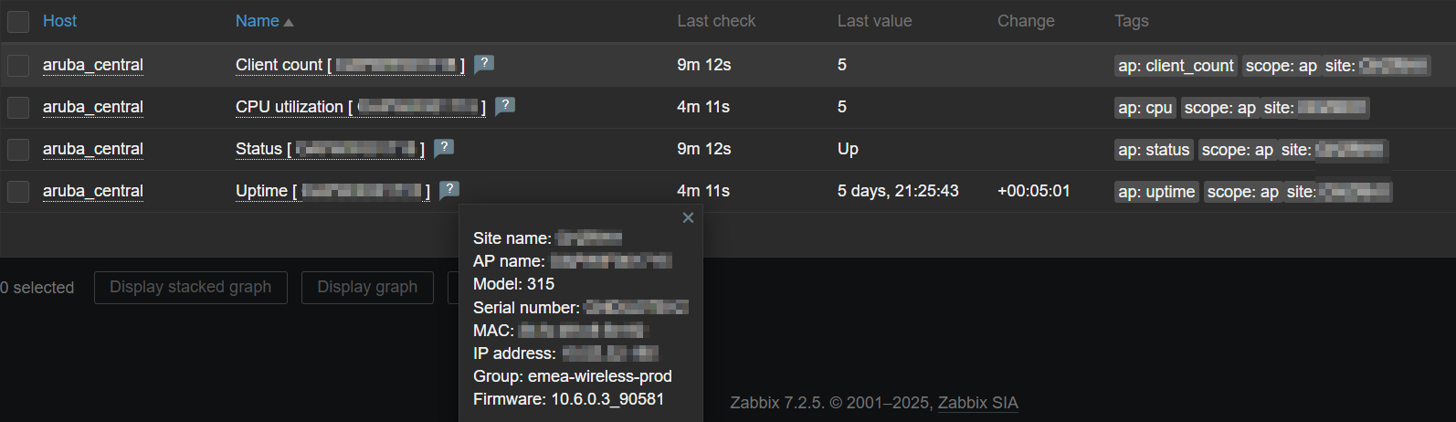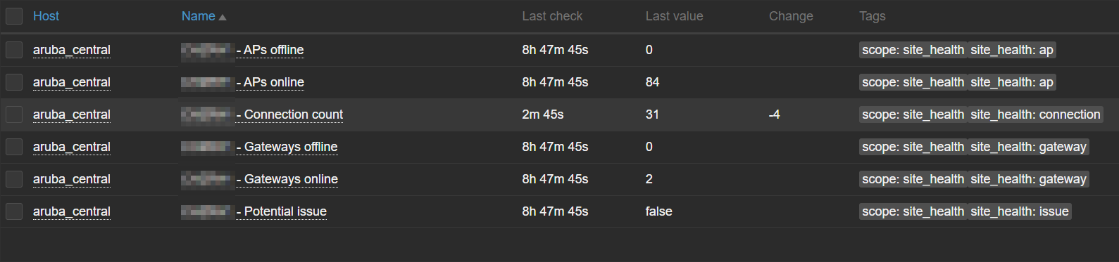 When everything is in place, then the monitoring part is pretty simple. The usual JSONPath based logic can be used. API call documentation can be found here. The template contains only the wireless components, since I do not have my switches in Central. Implementing the switching part should not be difficult – just have a look at the “Switch” section, then clone and adjust one of your “get” items.