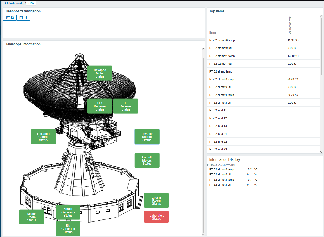 The main widget displays the radio telescopes, with additional buttons placed at specific locations that indicate whether there are any problems with equipment in that particular area. For example, the laboratory button is placed on the radio telescope schematic at the location where the laboratory is located. It is shown in green when everything is fine and in red when a problem has occurred with one of the servers in that room.