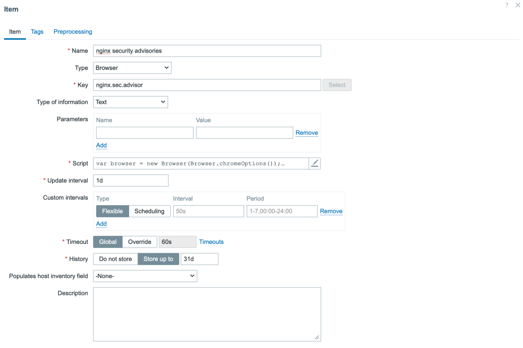 Note: The StartBrowserPollers parameter must be enabled on the Zabbix server or proxy configuration for browser items to work. It is enabled by default with the value StartBrowserPollers=1.