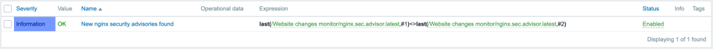 Create a trigger that compares the current and previous values of the “latest security advisories” item. If any change is detected, Zabbix will automatically send an alert notifying your team of the update.