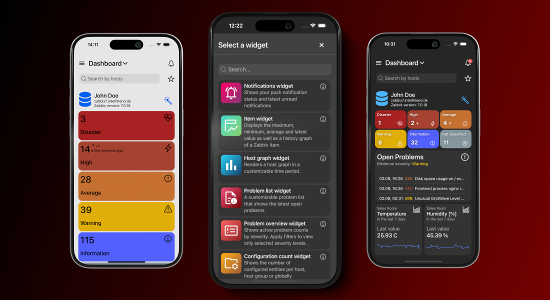 With IntelliTrend Mobile for Zabbix, you get a free, feature-rich mobile app for Zabbix, including real-time push notifications, custom mobile dashboards with unique widgets, built-in responsive host and item graphs, a detailed host viewer, and much more!