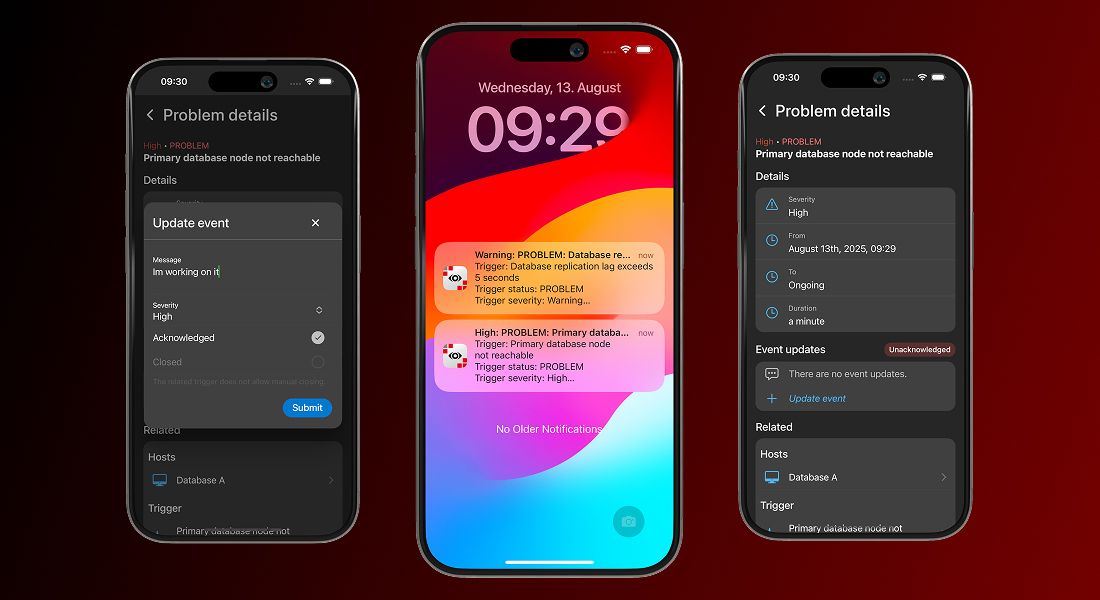 The official Zabbix frontend works great on desktop, but it isn’t built for mobile. Monitoring doesn’t end when you step away from your workstation, and a reliable Zabbix mobile app keeps you connected to your Zabbix environment, gives you instant notifications, and allows you to react to problems or just check your host configuration at any time.
